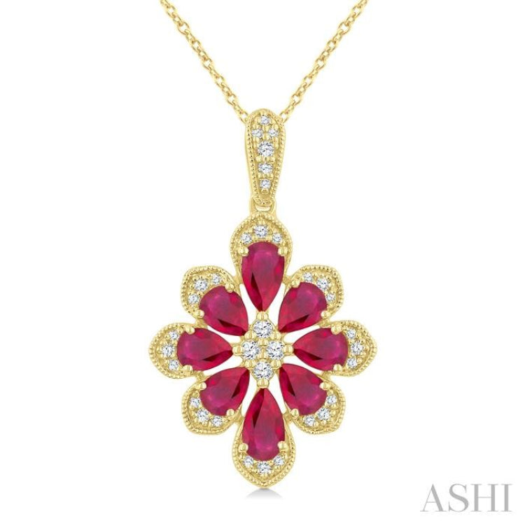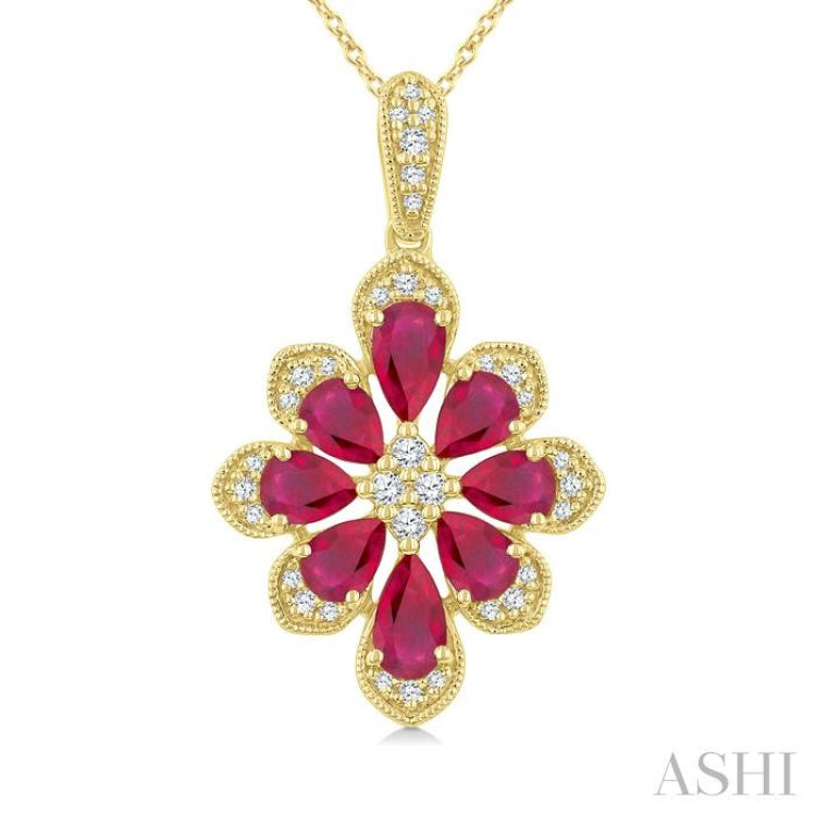1/6 Ctw Floral Motif 5X3MM & 4X3MM Pear Cut Ruby and Round Cut Diamond Precious Pendant With Chain in 10K Yellow Gold
