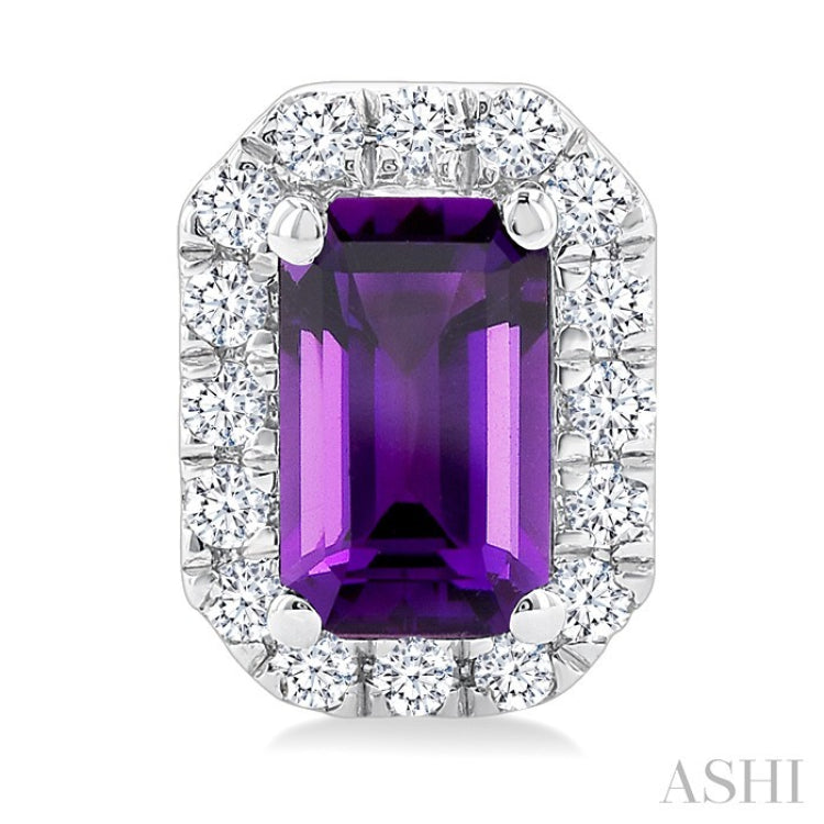 A bright and attractive Semi-Precious gemstone fashion halo stud earring, this makes an elegant addition to the jewelry case. It features an octagonal shape mount structure, with a 5x3 MM octagonal shape amethyst center stone each, total 2 on both studs. Apart from this, 16 micro wall set Round Cut diamonds each, total 32, halo the center stone. A push-back ear nut closure secures the Semi-Precious gemstone stud earrings, which are fashioned in a polished rhodium finish 10 karat white gold. Total diamond weight is 1/8 Ctw.